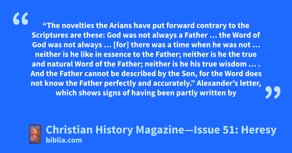 “The novelties the Arians have put forward contrary to the Scriptures are these: God was not always a Father … the Word of God was not always … [for] there was a time when he was not … neither is he like in essence to the Father; neither is he the true and natural Word of the Father; neither is he his true wisdom … . And the Father cannot be described by the Son, for the Word does not know the Father perfectly and accurately.” Alexander’s letter, which shows signs of having been partly written by