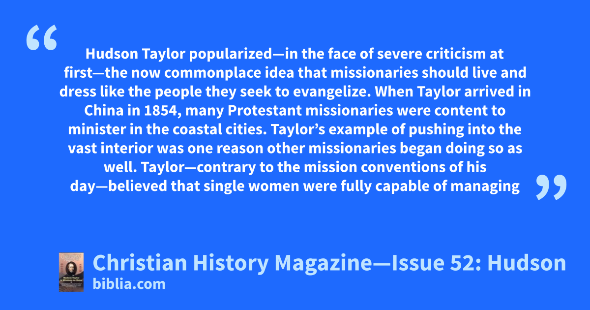 Hudson Taylor popularized—in the face of severe criticism at first—the now commonplace idea that missionaries should live and dress like the people they seek to evangelize. When Taylor arrived in China in 1854, many Protestant missionaries were content to minister in the coastal cities. Taylor’s example of pushing into the vast interior was one reason other missionaries began doing so as well. Taylor—contrary to the mission conventions of his day—believed that single women were fully capable of managing