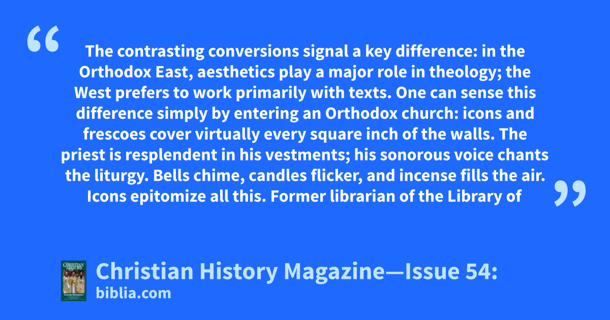 The contrasting conversions signal a key difference: in the Orthodox East, aesthetics play a major role in theology; the West prefers to work primarily with texts. One can sense this difference simply by entering an Orthodox church: icons and frescoes cover virtually every square inch of the walls. The priest is resplendent in his vestments; his sonorous voice chants the liturgy. Bells chime, candles flicker, and incense fills the air. Icons epitomize all this. Former librarian of the Library of