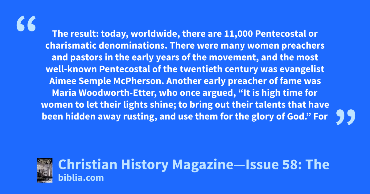 The result: today, worldwide, there are 11,000 Pentecostal or charismatic denominations. There were many women preachers and pastors in the early years of the movement, and the most well-known Pentecostal of the twentieth century was evangelist Aimee Semple McPherson. Another early preacher of fame was Maria Woodworth-Etter, who once argued, “It is high time for women to let their lights shine; to bring out their talents that have been hidden away rusting, and use them for the glory of God.” For