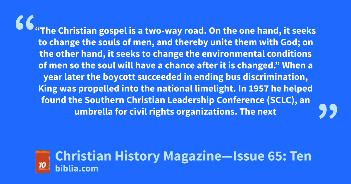 “The Christian gospel is a two-way road. On the one hand, it seeks to change the souls of men, and thereby unite them with God; on the other hand, it seeks to change the environmental conditions of men so the soul will have a chance after it is changed.” When a year later the boycott succeeded in ending bus discrimination, King was propelled into the national limelight. In 1957 he helped found the Southern Christian Leadership Conference (SCLC), an umbrella for civil rights organizations. The next