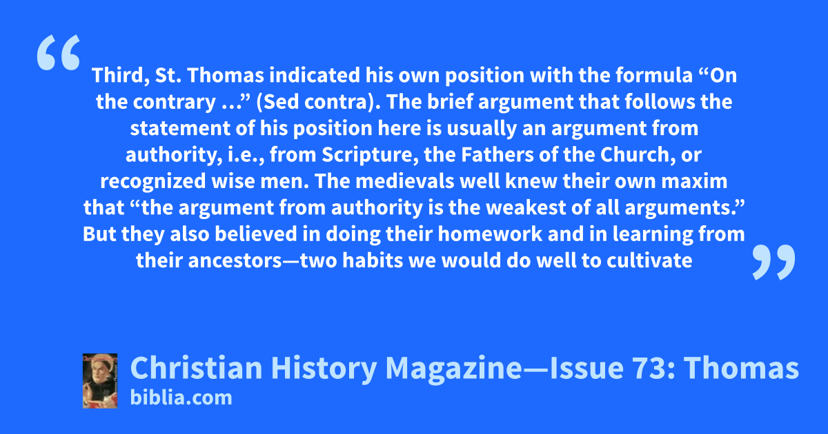 Third, St. Thomas indicated his own position with the formula “On the contrary …” (Sed contra). The brief argument that follows the statement of his position here is usually an argument from authority, i.e., from Scripture, the Fathers of the Church, or recognized wise men. The medievals well knew their own maxim that “the argument from authority is the weakest of all arguments.” But they also believed in doing their homework and in learning from their ancestors—two habits we would do well to cultivate