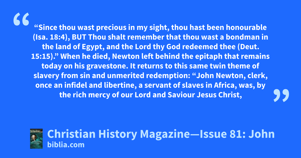 “Since thou wast precious in my sight, thou hast been honourable (Isa. 18:4), BUT Thou shalt remember that thou wast a bondman in the land of Egypt, and the Lord thy God redeemed thee (Deut. 15:15).” When he died, Newton left behind the epitaph that remains today on his gravestone. It returns to this same twin theme of slavery from sin and unmerited redemption: “John Newton, clerk, once an infidel and libertine, a servant of slaves in Africa, was, by the rich mercy of our Lord and Saviour Jesus Christ,