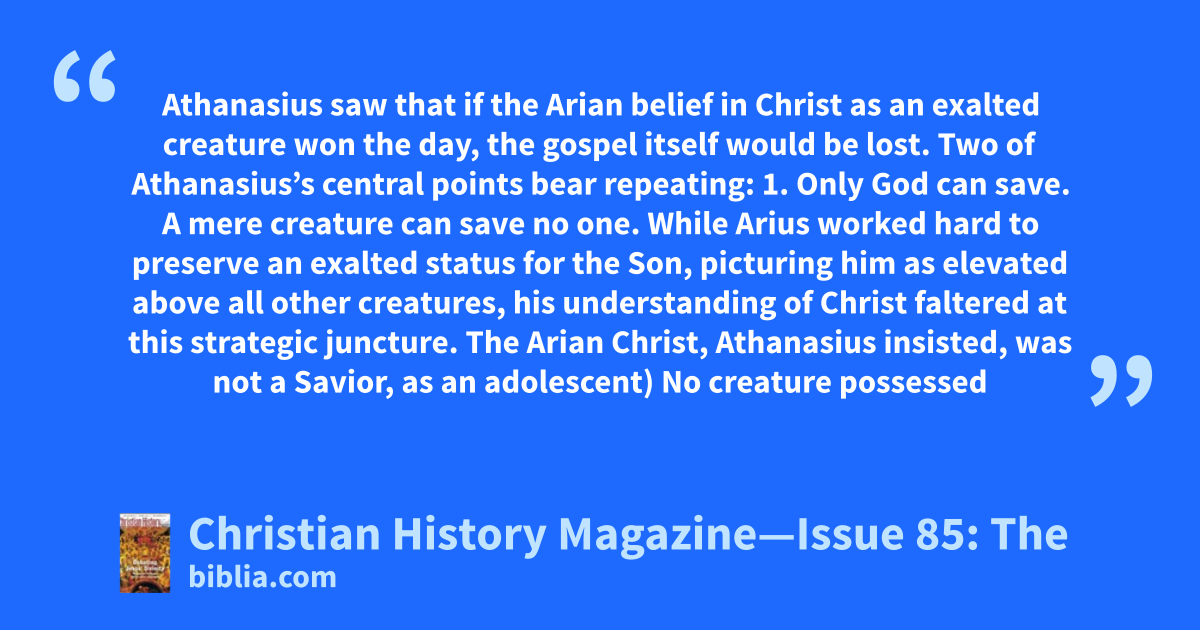 Athanasius saw that if the Arian belief in Christ as an exalted creature won the day, the gospel itself would be lost. Two of Athanasius’s central points bear repeating: 1. Only God can save. A mere creature can save no one. While Arius worked hard to preserve an exalted status for the Son, picturing him as elevated above all other creatures, his understanding of Christ faltered at this strategic juncture. The Arian Christ, Athanasius insisted, was not a Savior, as an adolescent) No creature possessed