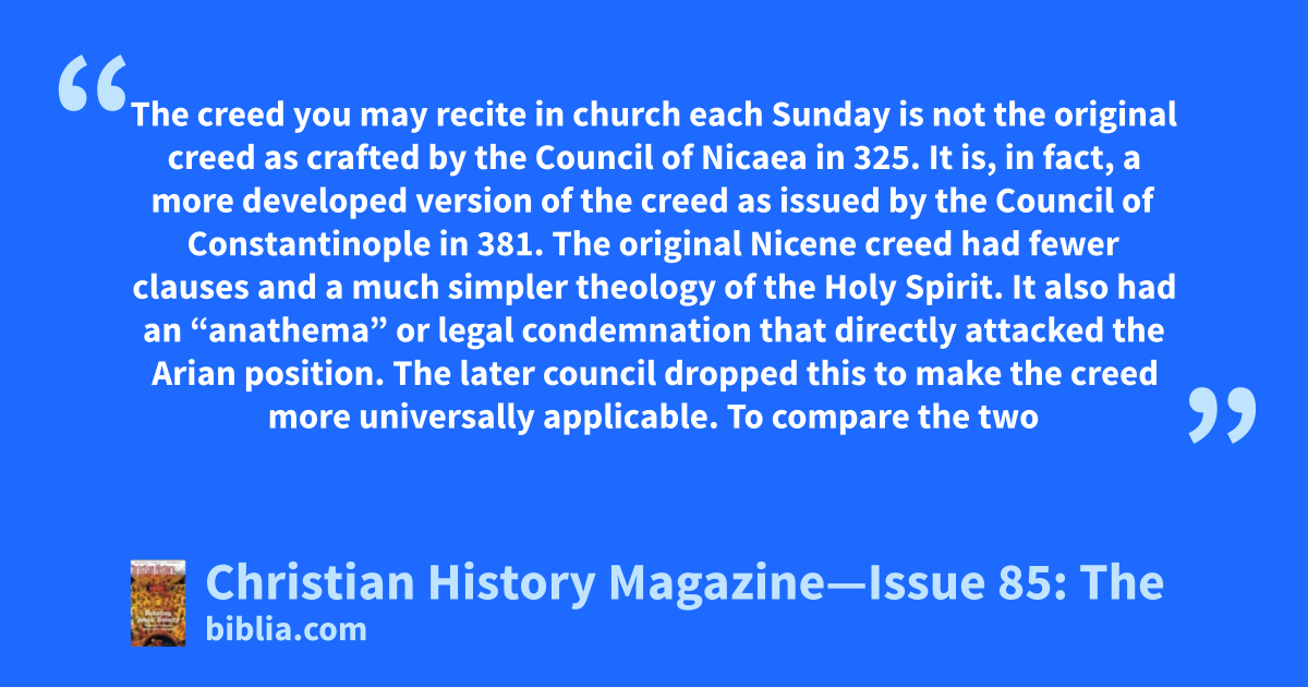The creed you may recite in church each Sunday is not the original creed as crafted by the Council of Nicaea in 325. It is, in fact, a more developed version of the creed as issued by the Council of Constantinople in 381. The original Nicene creed had fewer clauses and a much simpler theology of the Holy Spirit. It also had an “anathema” or legal condemnation that directly attacked the Arian position. The later council dropped this to make the creed more universally applicable. To compare the two