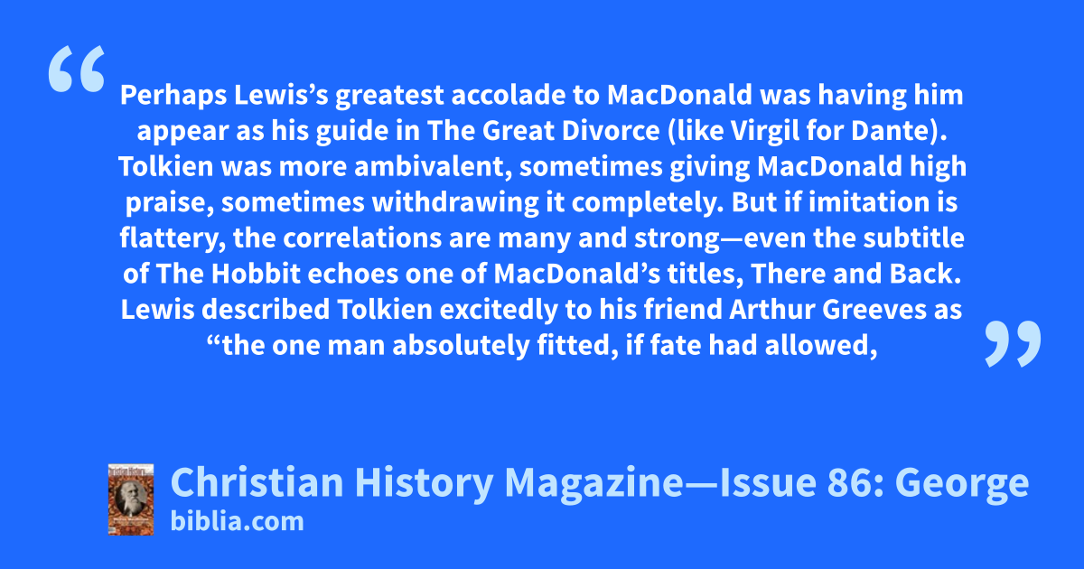 Perhaps Lewis’s greatest accolade to MacDonald was having him appear as his guide in The Great Divorce (like Virgil for Dante). Tolkien was more ambivalent, sometimes giving MacDonald high praise, sometimes withdrawing it completely. But if imitation is flattery, the correlations are many and strong—even the subtitle of The Hobbit echoes one of MacDonald’s titles, There and Back. Lewis described Tolkien excitedly to his friend Arthur Greeves as “the one man absolutely fitted, if fate had allowed,