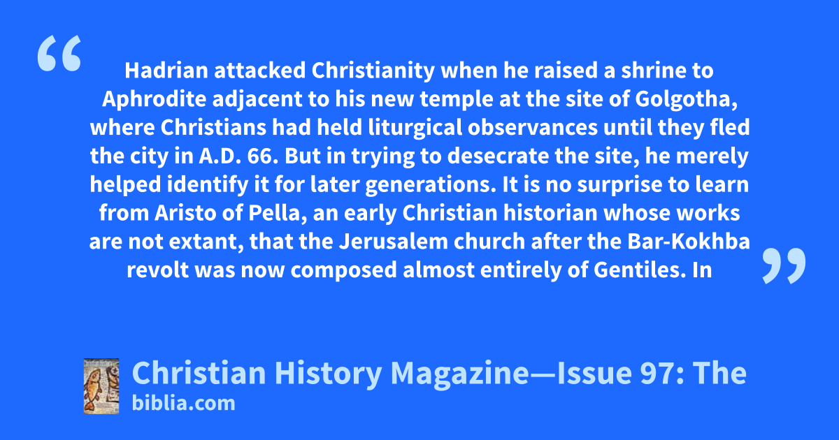 Hadrian attacked Christianity when he raised a shrine to Aphrodite adjacent to his new temple at the site of Golgotha, where Christians had held liturgical observances until they fled the city in A.D. 66. But in trying to desecrate the site, he merely helped identify it for later generations. It is no surprise to learn from Aristo of Pella, an early Christian historian whose works are not extant, that the Jerusalem church after the Bar-Kokhba revolt was now composed almost entirely of Gentiles. In