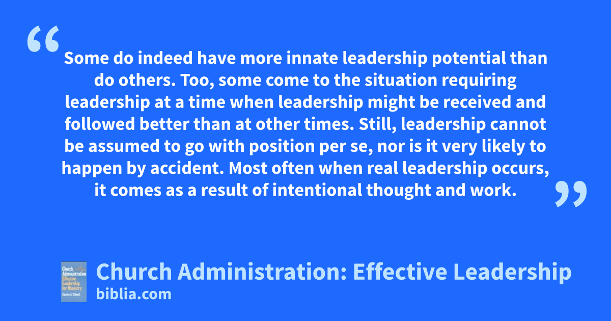Some do indeed have more innate leadership potential than do others. Too, some come to the situation requiring leadership at a time when leadership might be received and followed better than at other times. Still, leadership cannot be assumed to go with position per se, nor is it very likely to happen by accident. Most often when real leadership occurs, it comes as a result of intentional thought and work.