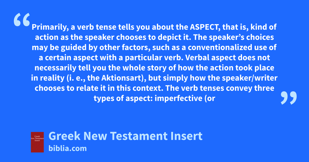 Primarily, a verb tense tells you about the ASPECT, that is, kind of action as the speaker chooses to depict it. The speaker’s choices may be guided by other factors, such as a conventionalized use of a certain aspect with a particular verb. Verbal aspect does not necessarily tell you the whole story of how the action took place in reality (i. e., the Aktionsart), but simply how the speaker/writer chooses to relate it in this context. The verb tenses convey three types of aspect: imperfective (or