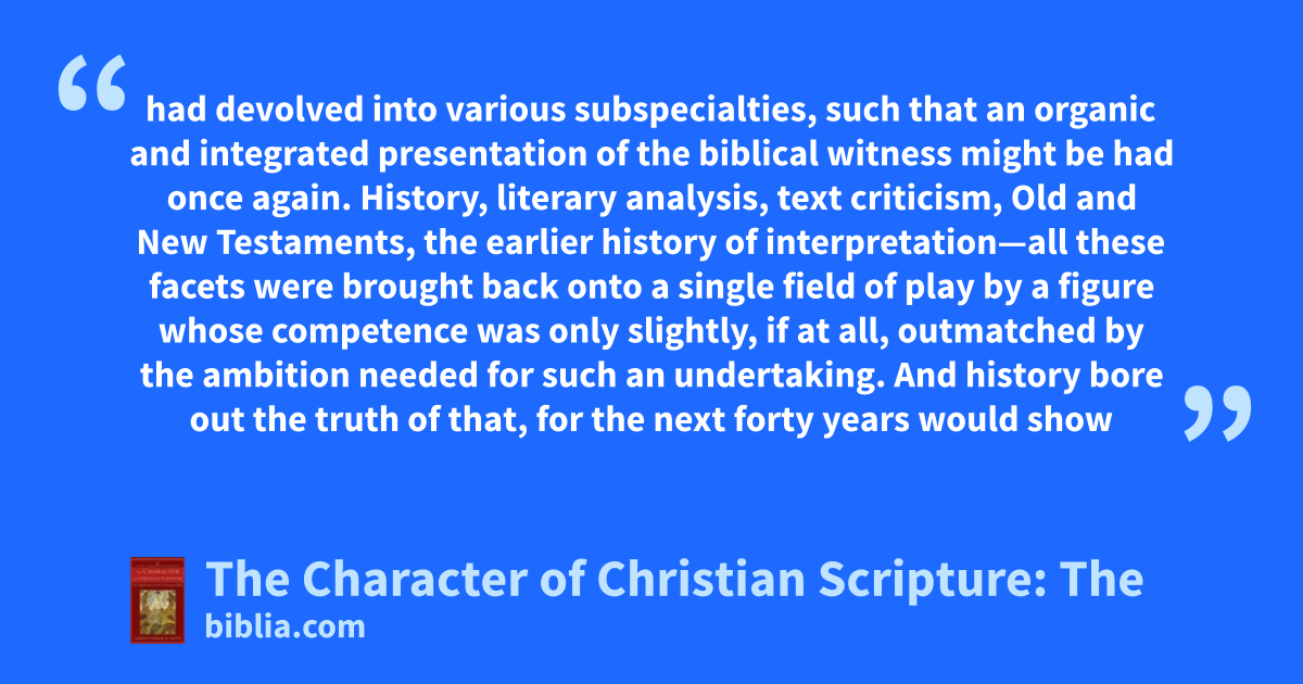 had devolved into various subspecialties, such that an organic and integrated presentation of the biblical witness might be had once again. History, literary analysis, text criticism, Old and New Testaments, the earlier history of interpretation—all these facets were brought back onto a single field of play by a figure whose competence was only slightly, if at all, outmatched by the ambition needed for such an undertaking. And history bore out the truth of that, for the next forty years would show