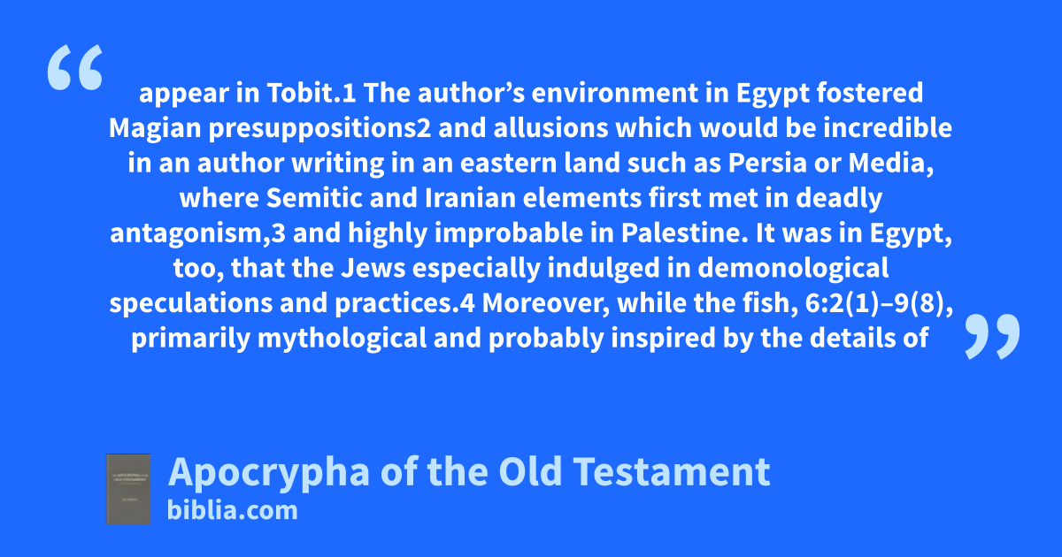 The hypothesis that Egypt was the place of composition alone serves to explain all the phenomena, and, at the same time, raises no additional difficulties, and encounters no legitimate objections on the part of the upholders of the Palestinian or Eastern origin of the work. This happy solution of the problem was first stated by Nöldeke, and has been accepted by Löhr, W. R. Smith, André, and others. It has lately received additional support from the discovery of the actual sources upon which the author depended for the plot, outline, literary allusions, and the non-Jewish stratum of his religious and speculative materials. Only Egyptian Jews could need an antidote to the Tractate of Khons. No trace can be found in Palestinian literature of any acquaintance with the Fable of the Grateful Dead. Only in Egypt, so far as is known, did either Jews or pagans read Aḥiḳar’s fortunes at the Assyrian court in exactly the chronological order in which they appear in Tobit.1 The author’s environment in Egypt fostered Magian presuppositions2 and allusions which would be incredible in an author writing in an eastern land such as Persia or Media, where Semitic and Iranian elements first met in deadly antagonism,3 and highly improbable in Palestine. It was in Egypt, too, that the Jews especially indulged in demonological speculations and practices.4 Moreover, while the fish, 6:2(1)–9(8), primarily mythological and probably inspired by the details of The Grateful Dead, symbolizes5 the pagan empire endeavouring to seize what portions it could of the pious Diaspora, the fact, on the other hand, that its inner organs are subsequently employed for medicinal and magical purposes suggests that the author, perhaps unconsciously, identified it with the crocodile of the Nile, on the banks of which he lived. ‘This conjecture is raised almost to certainty when we read in Ḳazwini 1:132 that the smell of the smoke of a crocodile’s liver cures epilepsy, and that its dung and gall cure leucoma, which was the cause of Tobit’s blindness.6 Very similar statements as to the medicinal virtues of the crocodile occur in Greek and Latin writers.’ Again, the binding of Asmodeus in Upper Egypt, though mythological in its origin (8:3, cf. note ad loc.), expresses the author’s conviction that Egypt, where he was compelled to live in exile, was the veritable dumping-ground of wickedness and sin, exactly as Zechariah regarded Babylon, the land of exile he knew best, whence some of his hearers had just returned and where exiles still lived, as the goal of the flying Ephah, wherein Wickedness was imprisoned, Zech. 5:5–11. Consequently our author excludes all unnecessary references to the specifically Egyptian life around him.7 His heroes are made to live out their lives in that distant part of the Diaspora, where Aḥiḳar, like Nehemiah, had held important positions at court. The rustic simplicity and idyllic life of the patriarchs8 fill in the details of the pictures. This, too, is the motive for the author’s careful substitution of Elymais in 2:10 for Egypt, which appears in Aḥiḳar as the country whither the sage journeyed to demonstrate his wisdom; he felt that Aḥiḳar was too good and noble a Jew ever to have been domiciled in Egypt or compelled to participate in the deliberations of the Egyptian court.9