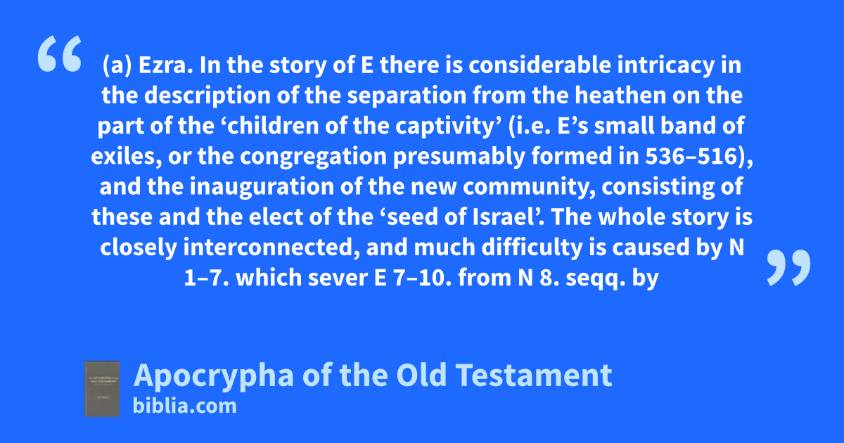 (a) Ezra. In the story of E there is considerable intricacy in the description of the separation from the heathen on the part of the ‘children of the captivity’ (i.e. E’s small band of exiles, or the congregation presumably formed in 536–516), and the inauguration of the new community, consisting of these and the elect of the ‘seed of Israel’. The whole story is closely interconnected, and much difficulty is caused by N 1–7. which sever E 7–10. from N 8. seqq. by twelve years. There is, moreover, a very strong presumption that the Reading of the Law was originally described shortly after E’s arrival (cf. E 9.), and not (as in N 8.) after this lengthy interval, during which we hear nothing of him. Finally, on independent grounds there seems to be no place for E before the first visit, at all events, of N. It is indeed allowed that ‘it is impossible to decide upon the evidence at our disposal’ (G. A. Smith, Expositor, July, 1906, p. 16), or that this later position of E is only a possibility (Wellhausen); but it seems very doubtful whether the story is trustworthy (H. P. Smith, Torrey, Jahn), and, even if it be historical, many agree that it cannot be placed before N 1–6. (Berth., Buhl, Cheyne, Guthe, Hoonacker [esp. Rev. Bibl., 10. 15 seqq.], Kennett, Kent, Kosters, Marq., Sellin, Wildeboer). See further the notes on E 8–10.