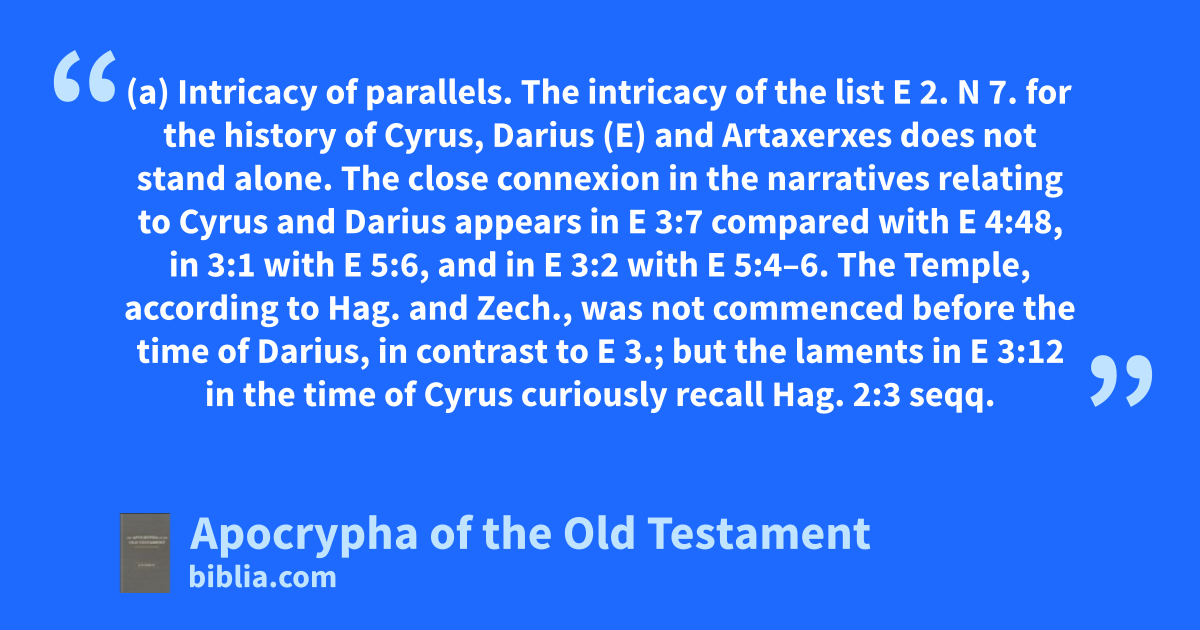 (a) Intricacy of parallels. The intricacy of the list E 2. N 7. for the history of Cyrus, Darius (E) and Artaxerxes does not stand alone. The close connexion in the narratives relating to Cyrus and Darius appears in E 3:7 compared with E 4:48, in 3:1 with E 5:6, and in E 3:2 with E 5:4–6. The Temple, according to Hag. and Zech., was not commenced before the time of Darius, in contrast to E 3.; but the laments in E 3:12 in the time of Cyrus curiously recall Hag. 2:3 seqq. The social and religious reorganization implied in E 2:59, 62, 6:21 finds a parallel in the reforms of E, and while E 2:70, 3:1, introduce the erection of the altar, the text in E 5:46 seq. presupposes a later period, and in fact these verses in N 7:73, 8:1, form the prelude to the Reading of the Law. The latter event is the sequel to the record of a return (N 7.) which in E 9. is that of E himself. E 3. is unhistorical, and has probably been influenced by material relating to the time of N; thus Meyer (73, 99) points to N 8:17 seq., and Jahn compares 3:10–13 with N 12:40–3. The account of the opposition in E 4. is untrustworthy, and there is a marked resemblance between the details and N 4., 6., enhanced by the insertion in E 4:7–24 of a record of the time of Artaxerxes. This record attests a return of some importance, which, however, has yet to be identified, and while the decrees of Cyrus and Darius agree (cf. also Artaxerxes and E) in presenting several very similar features (Torrey, 125 seqq., 158; Bayer, 117 seqq.), the historical basis for any decree on the lines they take cannot be found in their reigns. For parallels in the stories of E and N see above, p. 9 (d). Such is the interrelation of the contents that it is hardly surprising that later sources should not infrequently combine Zerubbabel and Ezra (Lag. 18; Torrey, 49 n. 17) and that both should be united with Jeshua in a return in the time of Darius (Lag. 84). Even N 12:47 looks back and mentions together Zerubbabel and N (see Berth.); and if Hashabiah and Sherebiah in N 12:24 may be identified with the names in E 8:18 seq., Joiakim (son of Jeshua) and E appear to be correlated much in the same way that N 12:12–26 seem to confuse the times of Joiakim, N and E (see also the view of Kosters, 91 seq.).