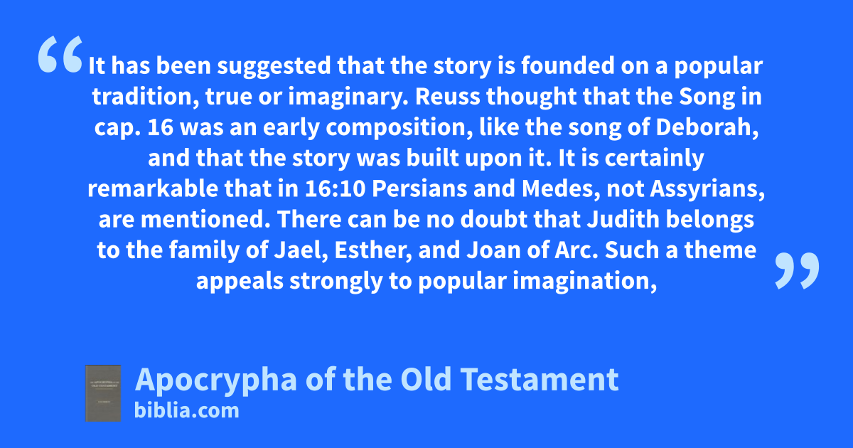It has been suggested that the story is founded on a popular tradition, true or imaginary. Reuss thought that the Song in cap. 16 was an early composition, like the song of Deborah, and that the story was built upon it. It is certainly remarkable that in 16:10 Persians and Medes, not Assyrians, are mentioned. There can be no doubt that Judith belongs to the family of Jael, Esther, and Joan of Arc. Such a theme appeals strongly to popular imagination, and even if based on fact, easily tends to be overlaid with fiction. Whatever may be the truth, the work, as we have it, is a consistent whole, and, with the possible exception of the song, shows no signs of being by more than one hand.