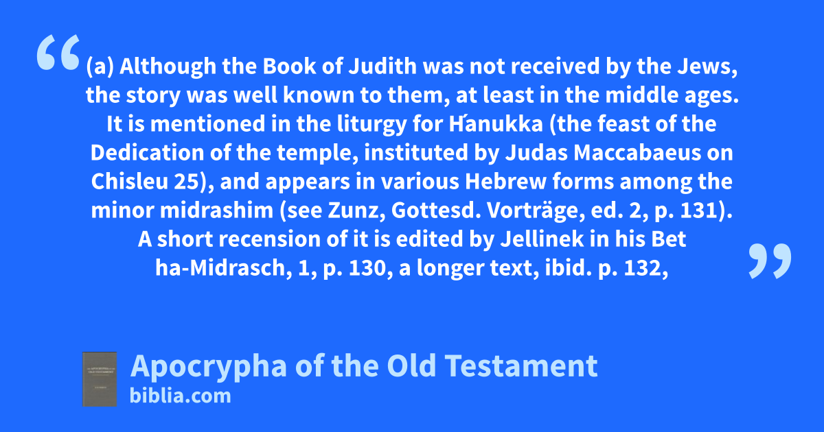 (a) Although the Book of Judith was not received by the Jews, the story was well known to them, at least in the middle ages. It is mentioned in the liturgy for H́anukka (the feast of the Dedication of the temple, instituted by Judas Maccabaeus on Chisleu 25), and appears in various Hebrew forms among the minor midrashim (see Zunz, Gottesd. Vorträge, ed. 2, p. 131). A short recension of it is edited by Jellinek in his Bet ha-Midrasch, 1, p. 130, a longer text, ibid. p. 132, and another, ibid. 2, p. 12. Three more forms of the story are found in MSS. of the Bodleian Library. See also Gaster in PSBA, 16, p. 156. A text translated from the Vulgate, and agreeing with that of two Bodleian MSS. (Heb. d. 11 f. 259 and ms. Opp. 712 f. 164), was published at Venice about 1651, under the title of מעשה יהודית. None of these is in any sense a translation of the Greek, still less the original form of the book. They are free sketches of a well-known story, set down from memory, like other מעשיות, in more or less detail according to the taste of the writer. They are usually short, and of no great antiquity. In the MSS. they are generally headed ‘for Hanukka’. Hebrew translations of the Greek were published by Meir b. Ascher at Berlin in 1766, by Benseb at Vienna in 1819, and by Fränkel at Leipzig in 1830 (with other apocrypha). A Judaeo-German translation by S. Landau appeared at Frankfurt a. M. in 1715. A Persian version exists in a Bodleian ms. (Hyde 19). It is anonymous, but is made from the Vulgate, and the ms. was probably written about 1600.