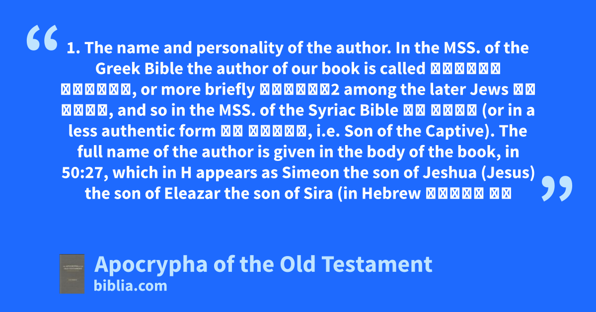 1. The name and personality of the author. In the MSS. of the Greek Bible the author of our book is called Ἰησοῦς Σειράχ, or more briefly Σειράχ2 among the later Jews בן סירא, and so in the MSS. of the Syriac Bible בר סירא (or in a less authentic form בר אסירא, i.e. Son of the Captive).