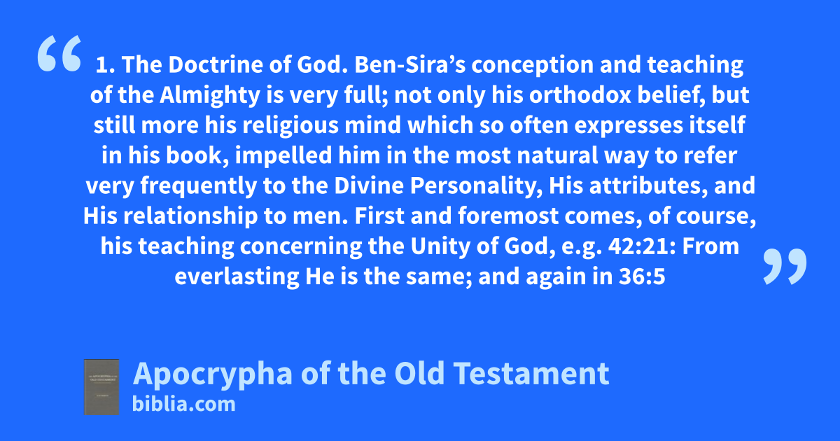 1. The Doctrine of God. Ben-Sira’s conception and teaching of the Almighty is very full; not only his orthodox belief, but still more his religious mind which so often expresses itself in his book, impelled him in the most natural way to refer very frequently to the Divine Personality, His attributes, and His relationship to men. First and foremost comes, of course, his teaching concerning the Unity of God, e.g. 42:21: