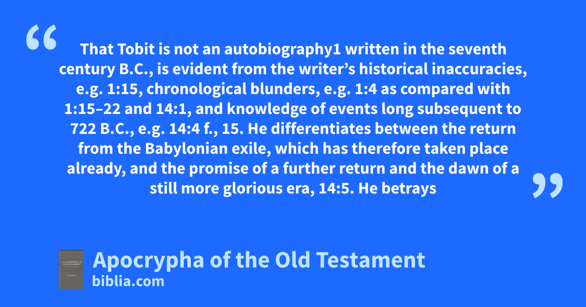 That Tobit is not an autobiography1 written in the seventh century b.c., is evident from the writer’s historical inaccuracies, e.g. 1:15, chronological blunders, e.g. 1:4 as compared with 1:15–22 and 14:1, and knowledge of events long subsequent to 722 b.c., e.g. 14:4 f., 15. He differentiates between the return from the Babylonian exile, which has therefore taken place already, and the promise of a further return and the dawn of a still more glorious era, 14:5. He betrays a religious as well as literary dependence on the latest portions of the Pentateuch.2 Similarly a date at the very earliest a little subsequent to the rise and establishment of Judaism is necessitated by his religious and moral teaching (see § 10). The same terminus a quo is favoured by the author’s general outlook, developed style, and artistic composition, the product of an age accustomed to the chronicling of singular experiences, 12:20, as well as to the somewhat formal drawing up of marriage contracts, 7:13 (14). Financial and commercial relations had superseded purely agricultural and pastoral pursuits, and the writer and his contemporaries had grown more or less accustomed to the foreign domination.