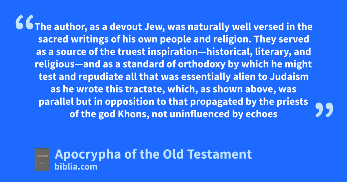 The author, as a devout Jew, was naturally well versed in the sacred writings of his own people and religion. They served as a source of the truest inspiration—historical, literary, and religious—and as a standard of orthodoxy by which he might test and repudiate all that was essentially alien to Judaism as he wrote this tractate, which, as shown above, was parallel but in opposition to that propagated by the priests of the god Khons, not uninfluenced by echoes of Zoroastrianism and dependent upon the pagan fable of The Grateful Dead and upon Aḥiḳar, which at the best was not specifically Jewish or deeply religious.