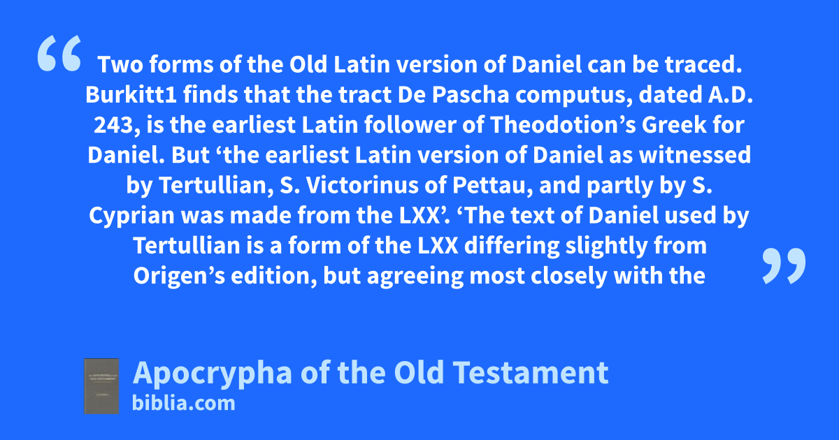 Two forms of the Old Latin version of Daniel can be traced. Burkitt1 finds that the tract De Pascha computus, dated a.d. 243, is the earliest Latin follower of Theodotion’s Greek for Daniel. But ‘the earliest Latin version of Daniel as witnessed by Tertullian, S. Victorinus of Pettau, and partly by S. Cyprian was made from the LXX’. ‘The text of Daniel used by Tertullian is a form of the LXX differing slightly from Origen’s edition, but agreeing most closely with the quotations of Justin Martyr’ (ib. p. 23). In Sabatier2 the Versio Antiqua preserves about forty-four verses of Susanna out of the sixty-five in the Vulgate. In these Theodotion’s version is much more obvious than the LXX. The verses at the beginning are given; and Sabatier adds, ‘Haec Susannae historia, si Flaminio Nobilio fides, in omnibus vetustis libris est principium Danielis, … in multis inscribitur Daniel ut in nostra; in quibusdam Συσαννα: in aliquo Διακρισις Δανιηλ.’2 In Cod. Wirceburgensis Palim. sixth century, Susanna vv. 2–10 survive.3