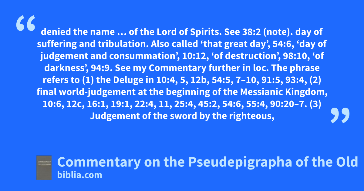 denied the name … of the Lord of Spirits. See 38:2 (note). day of suffering and tribulation. Also called ‘that great day’, 54:6, ‘day of judgement and consummation’, 10:12, ‘of destruction’, 98:10, ‘of darkness’, 94:9. See my Commentary further in loc. The phrase refers to (1) the Deluge in 10:4, 5, 12b, 54:5, 7–10, 91:5, 93:4, (2) final world-judgement at the beginning of the Messianic Kingdom, 10:6, 12c, 16:1, 19:1, 22:4, 11, 25:4, 45:2, 54:6, 55:4, 90:20–7. (3) Judgement of the sword by the righteous,