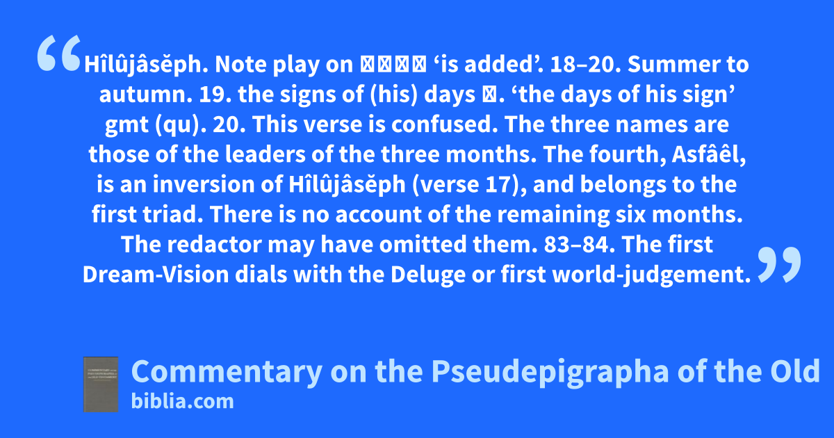Hîlûjâsĕph. Note play on נוסף ‘is added’. 18–20. Summer to autumn. 19. the signs of (his) days β. ‘the days of his sign’ gmt (qu). 20. This verse is confused. The three names are those of the leaders of the three months. The fourth, Asfâêl, is an inversion of Hîlûjâsĕph (verse 17), and belongs to the first triad. There is no account of the remaining six months. The redactor may have omitted them. 83–84. The first Dream-Vision dials with the Deluge or first world-judgement.