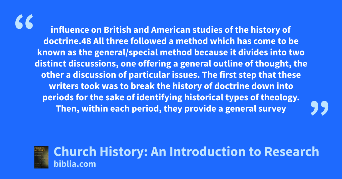 influence on British and American studies of the history of doctrine.48 All three followed a method which has come to be known as the general/special method because it divides into two distinct discussions, one offering a general outline of thought, the other a discussion of particular issues. The first step that these writers took was to break the history of doctrine down into periods for the sake of identifying historical types of theology. Then, within each period, they provide a general survey