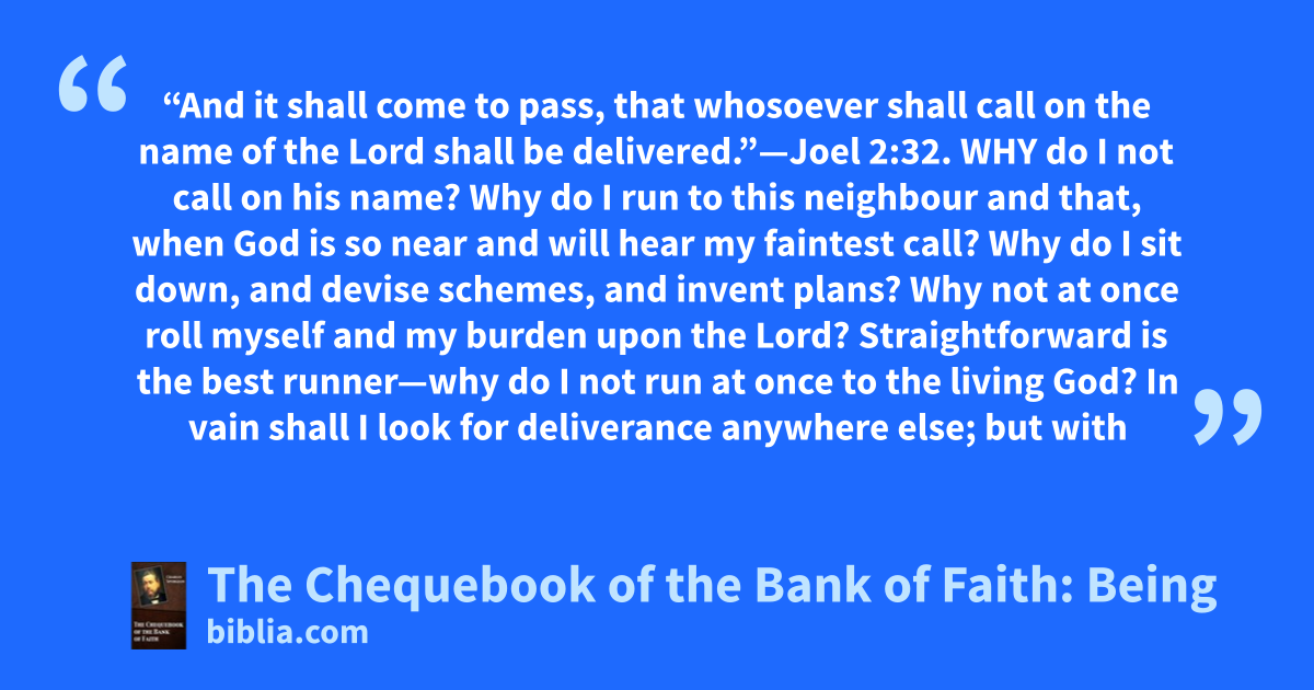 “And it shall come to pass, that whosoever shall call on the name of the Lord shall be delivered.”—Joel 2:32. WHY do I not call on his name? Why do I run to this neighbour and that, when God is so near and will hear my faintest call? Why do I sit down, and devise schemes, and invent plans? Why not at once roll myself and my burden upon the Lord? Straightforward is the best runner—why do I not run at once to the living God? In vain shall I look for deliverance anywhere else; but with