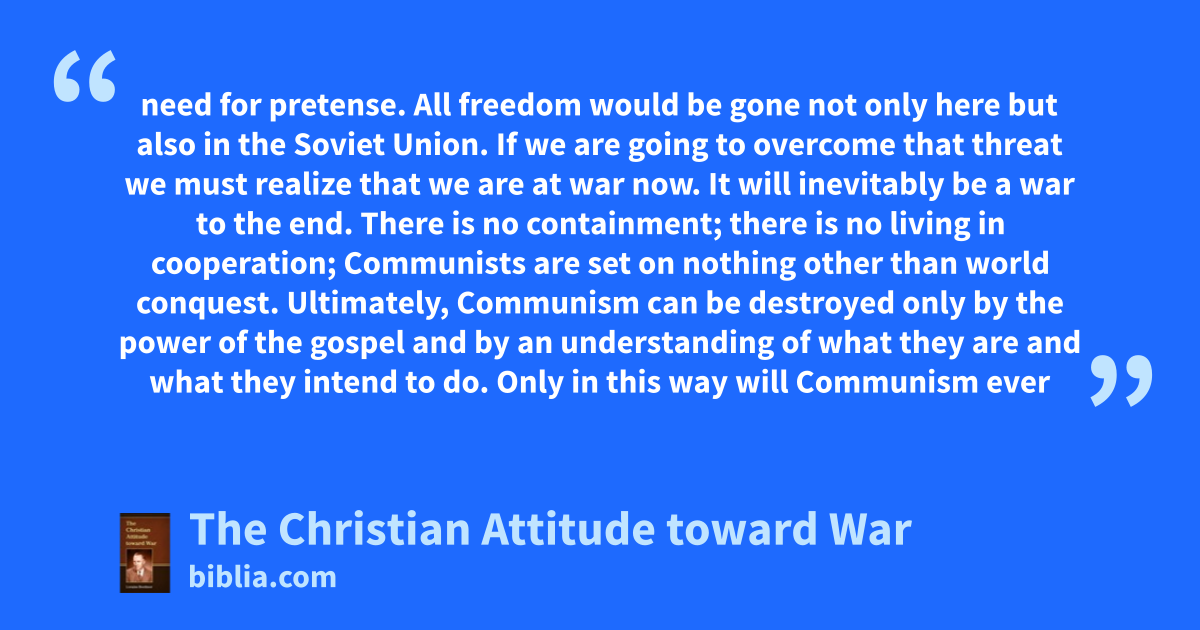 need for pretense. All freedom would be gone not only here but also in the Soviet Union. If we are going to overcome that threat we must realize that we are at war now. It will inevitably be a war to the end. There is no containment; there is no living in cooperation; Communists are set on nothing other than world conquest. Ultimately, Communism can be destroyed only by the power of the gospel and by an understanding of what they are and what they intend to do. Only in this way will Communism ever