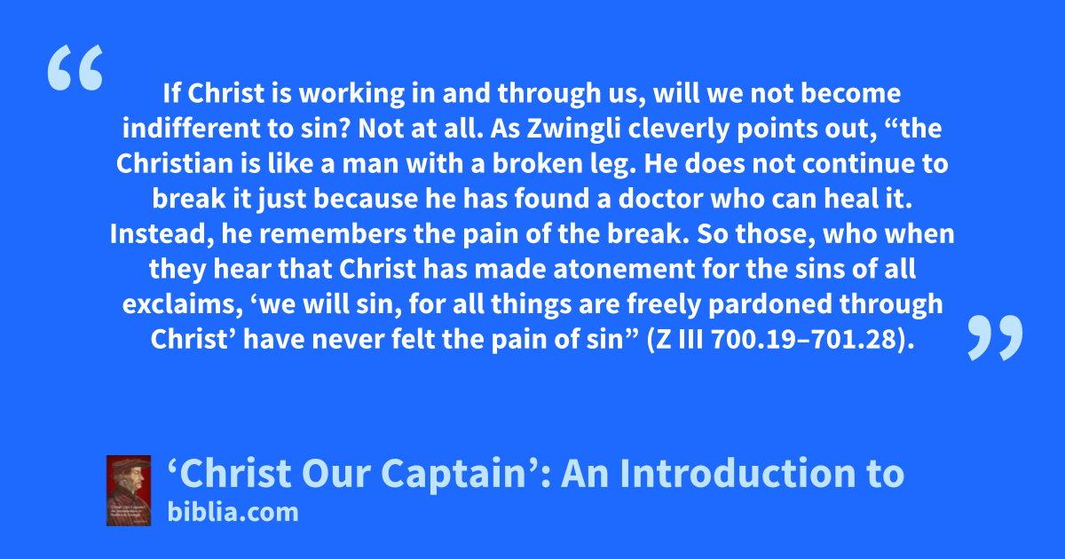 If Christ is working in and through us, will we not become indifferent to sin? Not at all. As Zwingli cleverly points out, “the Christian is like a man with a broken leg. He does not continue to break it just because he has found a doctor who can heal it. Instead, he remembers the pain of the break. So those, who when they hear that Christ has made atonement for the sins of all exclaims, ‘we will sin, for all things are freely pardoned through Christ’ have never felt the pain of sin” (Z III 700.19–701.28).