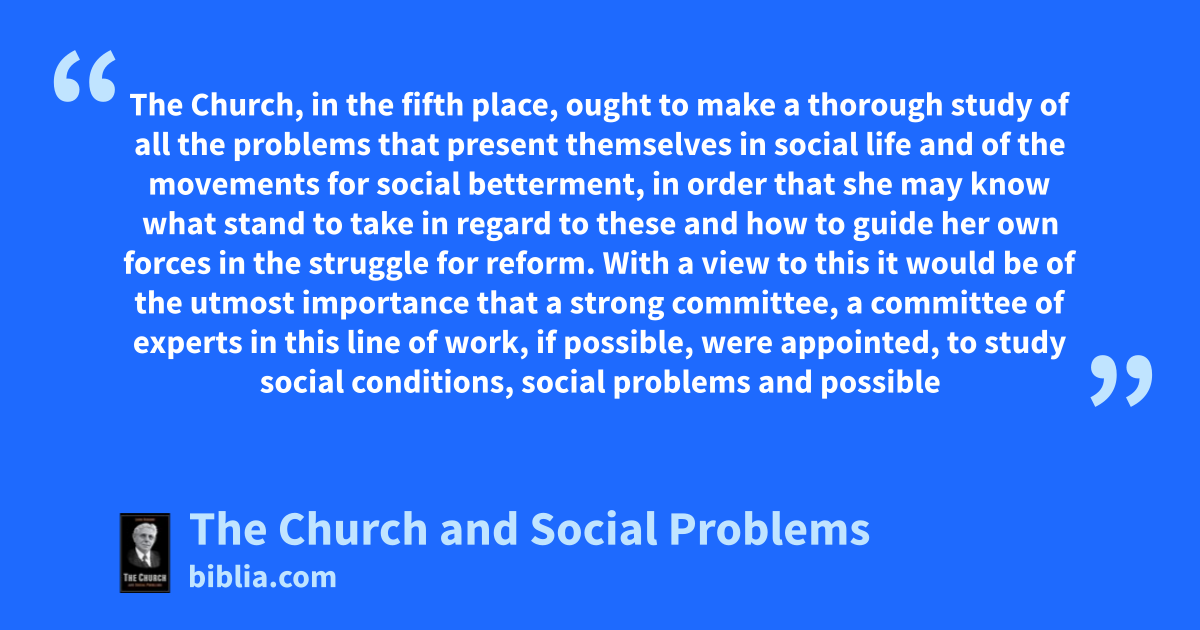 The Church, in the fifth place, ought to make a thorough study of all the problems that present themselves in social life and of the movements for social betterment, in order that she may know what stand to take in regard to these and how to guide her own forces in the struggle for reform. With a view to this it would be of the utmost importance that a strong committee, a committee of experts in this line of work, if possible, were appointed, to study social conditions, social problems and possible