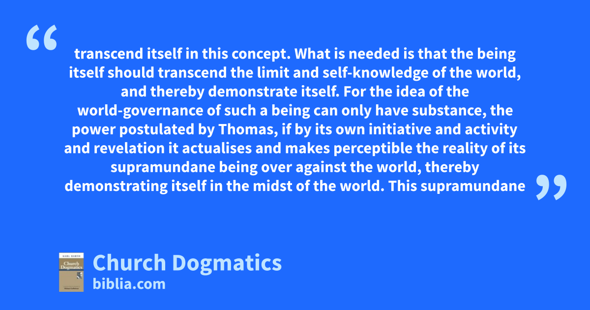 transcend itself in this concept. What is needed is that the being itself should transcend the limit and self-knowledge of the world, and thereby demonstrate itself. For the idea of the world-governance of such a being can only have substance, the power postulated by Thomas, if by its own initiative and activity and revelation it actualises and makes perceptible the reality of its supramundane being over against the world, thereby demonstrating itself in the midst of the world. This supramundane