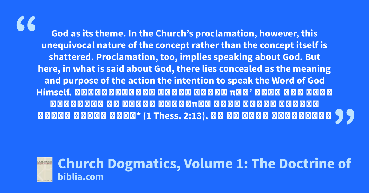God as its theme. In the Church’s proclamation, however, this unequivocal nature of the concept rather than the concept itself is shattered. Proclamation, too, implies speaking about God. But here, in what is said about God, there lies concealed as the meaning and purpose of the action the intention to speak the Word of God Himself. Παραλαβόντες λόγον ἀκοῆς παρʼ ἡμῶν τοῦ θεοῦ ἐδέξασθε οὐ λόγου ἀνθρώπων ἀλλὰ καθὼς ἀληθῶς ἐστιν λόγον θεοῦ* (1 Thess. 2:13). ὡς ἐκ θεοῦ κατέναντι