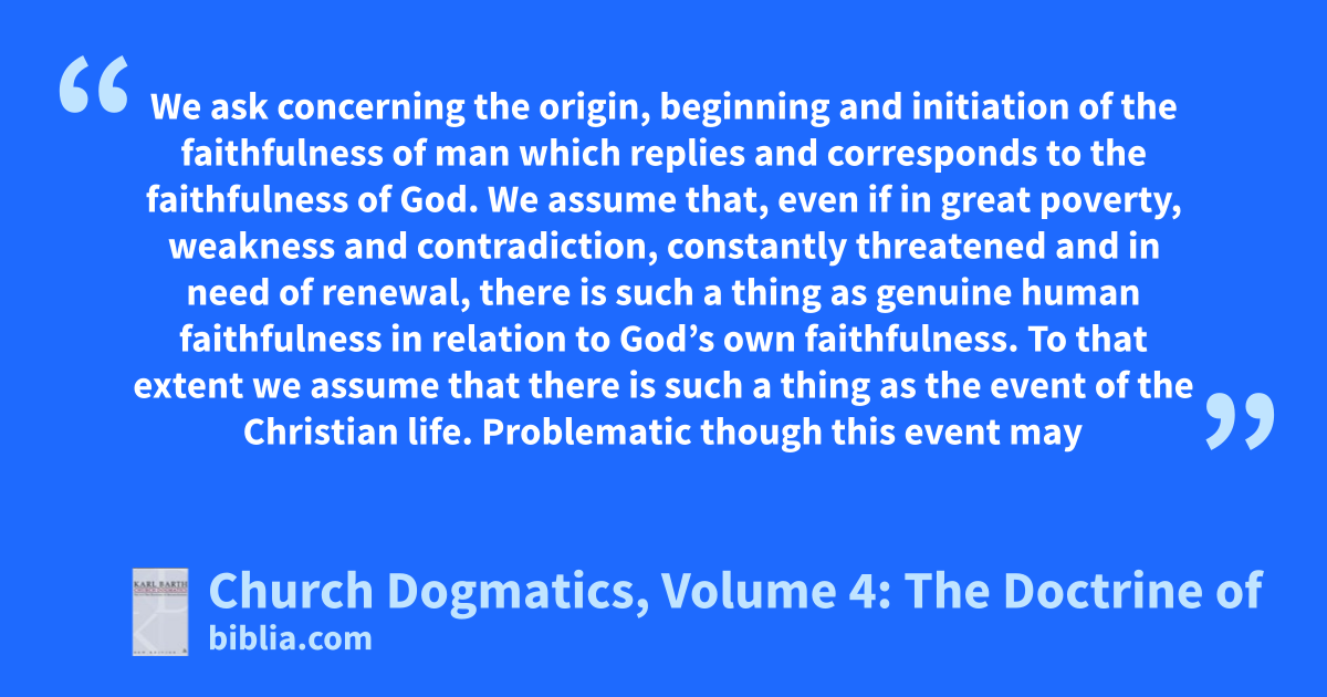 We ask concerning the origin, beginning and initiation of the faithfulness of man which replies and corresponds to the faithfulness of God. We assume that, even if in great poverty, weakness and contradiction, constantly threatened and in need of renewal, there is such a thing as genuine human faithfulness in relation to God’s own faithfulness. To that extent we assume that there is such a thing as the event of the Christian life. Problematic though this event may