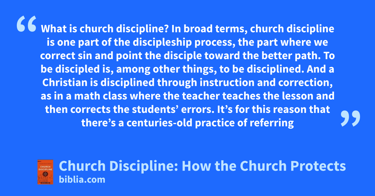 What is church discipline? In broad terms, church discipline is one part of the discipleship process, the part where we correct sin and point the disciple toward the better path. To be discipled is, among other things, to be disciplined. And a Christian is disciplined through instruction and correction, as in a math class where the teacher teaches the lesson and then corrects the students’ errors. It’s for this reason that there’s a centuries-old practice of referring