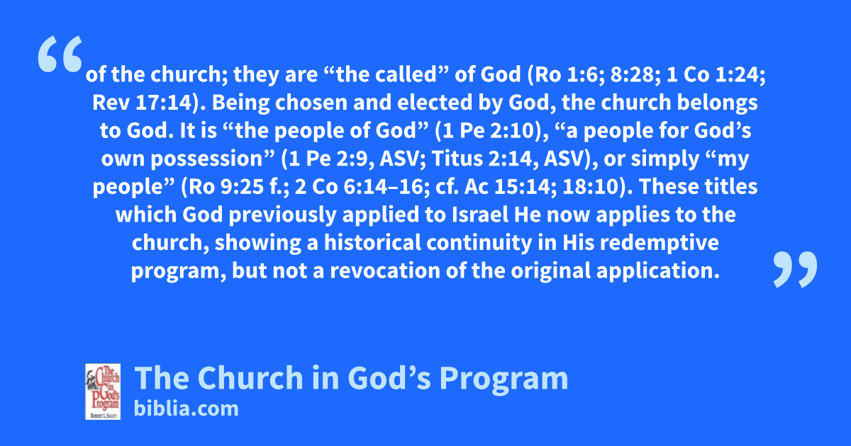 of the church; they are “the called” of God (Ro 1:6; 8:28; 1 Co 1:24; Rev 17:14). Being chosen and elected by God, the church belongs to God. It is “the people of God” (1 Pe 2:10), “a people for God’s own possession” (1 Pe 2:9, ASV; Titus 2:14, ASV), or simply “my people” (Ro 9:25 f.; 2 Co 6:14–16; cf. Ac 15:14; 18:10). These titles which God previously applied to Israel He now applies to the church, showing a historical continuity in His redemptive program, but not a revocation of the original application.
