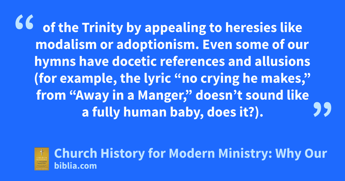 of the Trinity by appealing to heresies like modalism or adoptionism. Even some of our hymns have docetic references and allusions (for example, the lyric “no crying he makes,” from “Away in a Manger,” doesn’t sound like a fully human baby, does it?).
