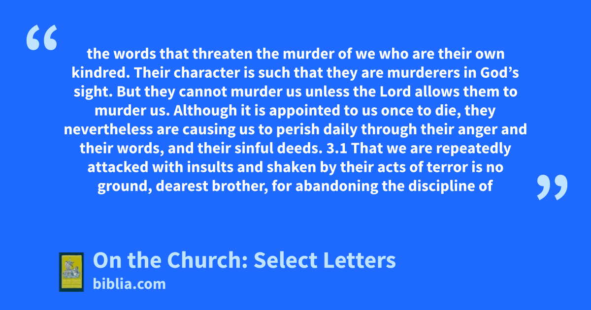 the words that threaten the murder of we who are their own kindred. Their character is such that they are murderers in God’s sight. But they cannot murder us unless the Lord allows them to murder us. Although it is appointed to us once to die, they nevertheless are causing us to perish daily through their anger and their words, and their sinful deeds. 3.1 That we are repeatedly attacked with insults and shaken by their acts of terror is no ground, dearest brother, for abandoning the discipline of