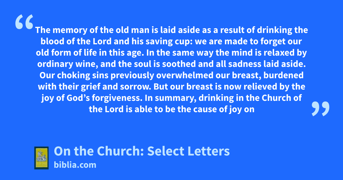 The memory of the old man is laid aside as a result of drinking the blood of the Lord and his saving cup: we are made to forget our old form of life in this age. In the same way the mind is relaxed by ordinary wine, and the soul is soothed and all sadness laid aside. Our choking sins previously overwhelmed our breast, burdened with their grief and sorrow. But our breast is now relieved by the joy of God’s forgiveness. In summary, drinking in the Church of the Lord is able to be the cause of joy on