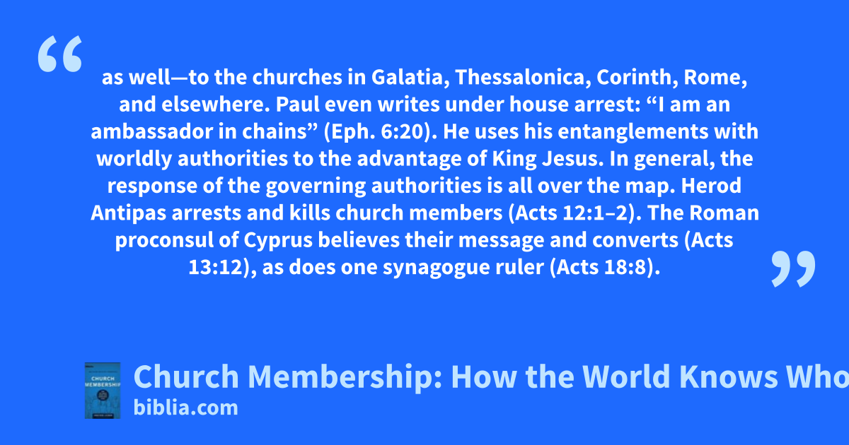 as well—to the churches in Galatia, Thessalonica, Corinth, Rome, and elsewhere. Paul even writes under house arrest: “I am an ambassador in chains” (Eph. 6:20). He uses his entanglements with worldly authorities to the advantage of King Jesus. In general, the response of the governing authorities is all over the map. Herod Antipas arrests and kills church members (Acts 12:1–2). The Roman proconsul of Cyprus believes their message and converts (Acts 13:12), as does one synagogue ruler (Acts 18:8).