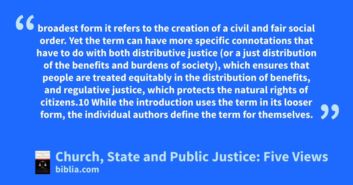 broadest form it refers to the creation of a civil and fair social order. Yet the term can have more specific connotations that have to do with both distributive justice (or a just distribution of the benefits and burdens of society), which ensures that people are treated equitably in the distribution of benefits, and regulative justice, which protects the natural rights of citizens.10 While the introduction uses the term in its looser form, the individual authors define the term for themselves.