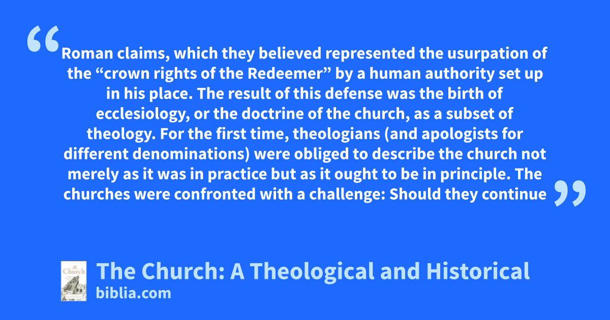 Roman claims, which they believed represented the usurpation of the “crown rights of the Redeemer” by a human authority set up in his place. The result of this defense was the birth of ecclesiology, or the doctrine of the church, as a subset of theology. For the first time, theologians (and apologists for different denominations) were obliged to describe the church not merely as it was in practice but as it ought to be in principle. The churches were confronted with a challenge: Should they continue