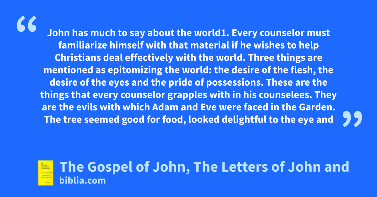 John has much to say about the world1. Every counselor must familiarize himself with that material if he wishes to help Christians deal effectively with the world. Three things are mentioned as epitomizing the world: the desire of the flesh, the desire of the eyes and the pride of possessions. These are the things that every counselor grapples with in his counselees. They are the evils with which Adam and Eve were faced in the Garden. The tree seemed good for food, looked delightful to the eye and