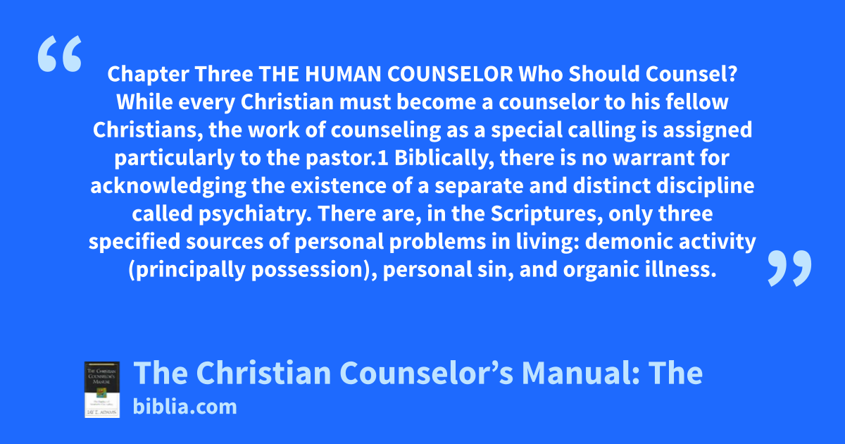 Chapter Three THE HUMAN COUNSELOR Who Should Counsel? While every Christian must become a counselor to his fellow Christians, the work of counseling as a special calling is assigned particularly to the pastor.1 Biblically, there is no warrant for acknowledging the existence of a separate and distinct discipline called psychiatry. There are, in the Scriptures, only three specified sources of personal problems in living: demonic activity (principally possession), personal sin, and organic illness.