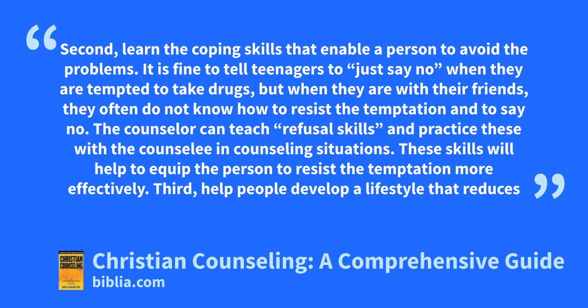 Second, learn the coping skills that enable a person to avoid the problems. It is fine to tell teenagers to “just say no” when they are tempted to take drugs, but when they are with their friends, they often do not know how to resist the temptation and to say no. The counselor can teach “refusal skills” and practice these with the counselee in counseling situations. These skills will help to equip the person to resist the temptation more effectively. Third, help people develop a lifestyle that reduces
