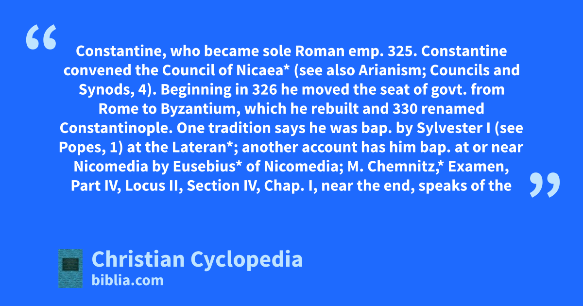 Constantine, who became sole Roman emp. 325. Constantine convened the Council of Nicaea* (see also Arianism; Councils and Synods, 4). Beginning in 326 he moved the seat of govt. from Rome to Byzantium, which he rebuilt and 330 renamed Constantinople. One tradition says he was bap. by Sylvester I (see Popes, 1) at the Lateran*; another account has him bap. at or near Nicomedia by Eusebius* of Nicomedia; M. Chemnitz,* Examen, Part IV, Locus II, Section IV, Chap. I, near the end, speaks of the