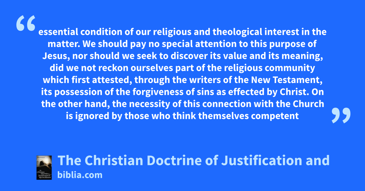 essential condition of our religious and theological interest in the matter. We should pay no special attention to this purpose of Jesus, nor should we seek to discover its value and its meaning, did we not reckon ourselves part of the religious community which first attested, through the writers of the New Testament, its possession of the forgiveness of sins as effected by Christ. On the other hand, the necessity of this connection with the Church is ignored by those who think themselves competent