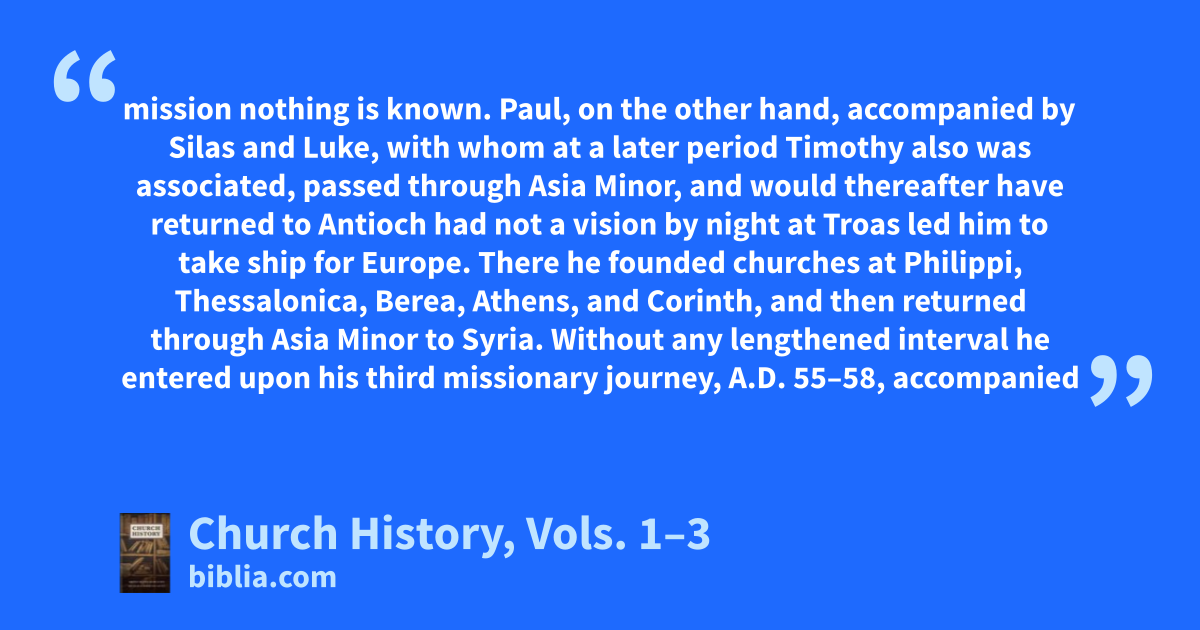 mission nothing is known. Paul, on the other hand, accompanied by Silas and Luke, with whom at a later period Timothy also was associated, passed through Asia Minor, and would thereafter have returned to Antioch had not a vision by night at Troas led him to take ship for Europe. There he founded churches at Philippi, Thessalonica, Berea, Athens, and Corinth, and then returned through Asia Minor to Syria. Without any lengthened interval he entered upon his third missionary journey, A.D. 55–58, accompanied