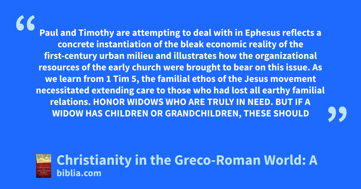 Paul and Timothy are attempting to deal with in Ephesus reflects a concrete instantiation of the bleak economic reality of the first-century urban milieu and illustrates how the organizational resources of the early church were brought to bear on this issue. As we learn from 1 Tim 5, the familial ethos of the Jesus movement necessitated extending care to those who had lost all earthy familial relations. HONOR WIDOWS WHO ARE TRULY IN NEED. BUT IF A WIDOW HAS CHILDREN OR GRANDCHILDREN, THESE SHOULD