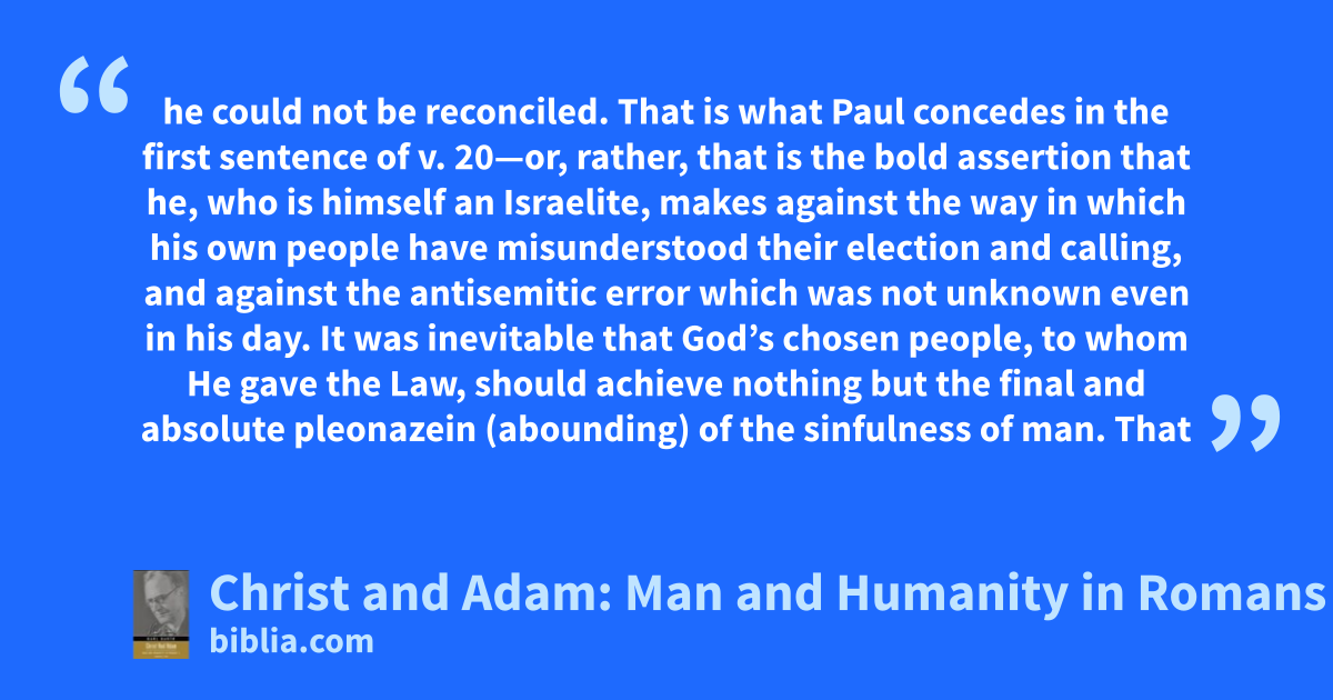 he could not be reconciled. That is what Paul concedes in the first sentence of v. 20—or, rather, that is the bold assertion that he, who is himself an Israelite, makes against the way in which his own people have misunderstood their election and calling, and against the antisemitic error which was not unknown even in his day. It was inevitable that God’s chosen people, to whom He gave the Law, should achieve nothing but the final and absolute pleonazein (abounding) of the sinfulness of man. That